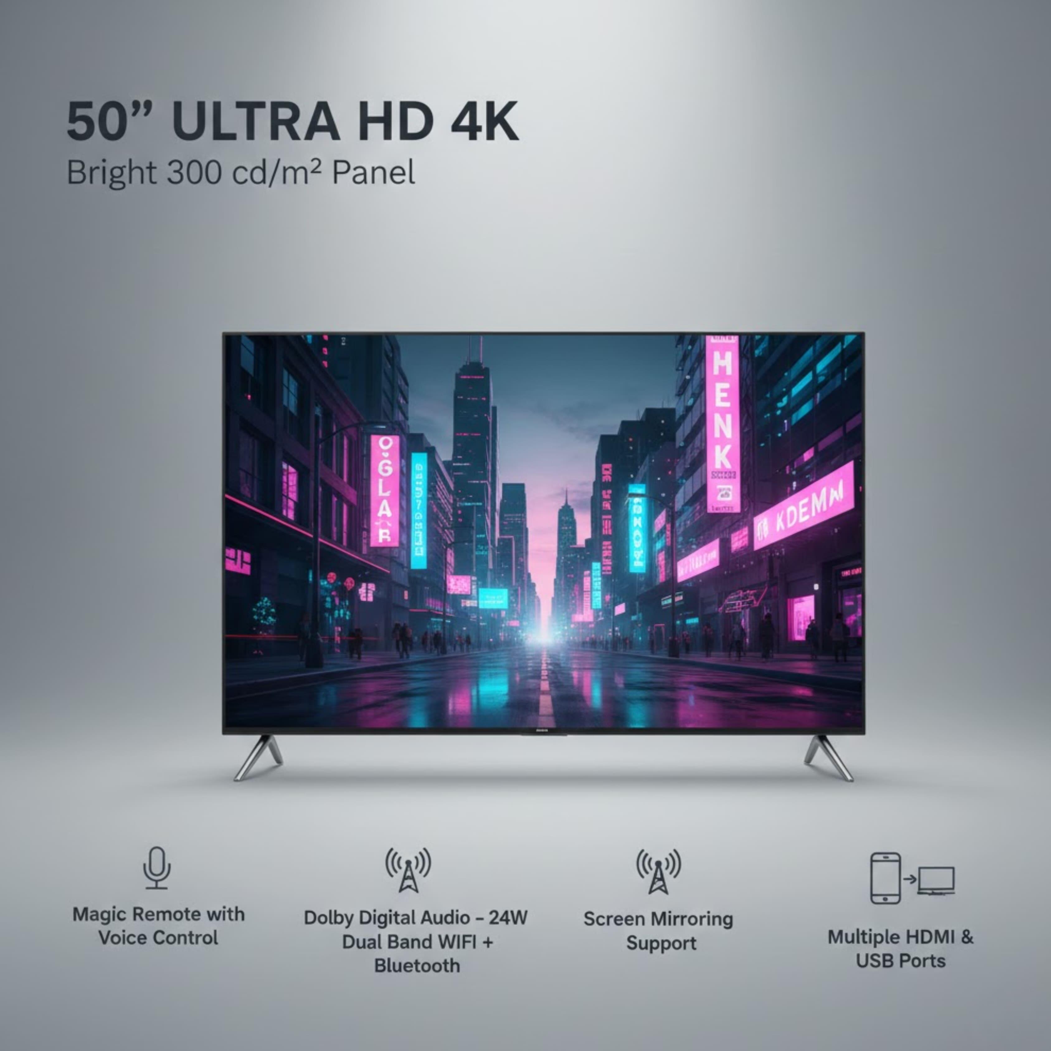 Bring the cinema home with the 50-inch WebOS 4K UHD Smart TV. Its bright 300 nits display and high contrast ratio deliver sharp, lifelike visuals for movies and sports. With WebOS, you get instant access to OTT apps, while Miracast and Bluetooth make sharing easy.